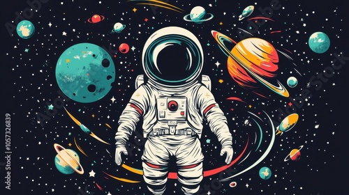 A vibrant flat design illustration of an astronaut insignia, showcasing a unique space mission patch with symbolic elements representing exploration and adventure.