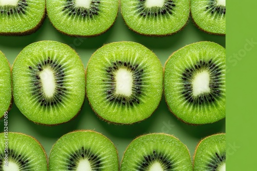 A vibrant flatlay showcasing numerous perfectly arranged, cross-sectioned kiwi slices on a muted green background. The kiwis display their characteristic bright green flesh and tiny black seeds