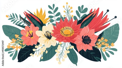 A vibrant floral arrangement featuring various colorful flowers and lush greenery, perfect for adding a refreshing touch to any design.