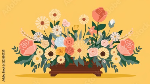 A vibrant floral arrangement in pastel colors features roses, daisies, and wildflowers set against a cheerful yellow backdrop.