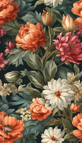 A vibrant floral pattern featuring large peonies, lilies, and other assorted flowers in shades of coral, white, and green against a dark background.