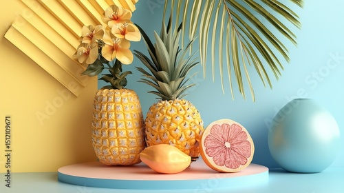 A vibrant flower arrangement featuring colorful fruits against a pastel geometric background.