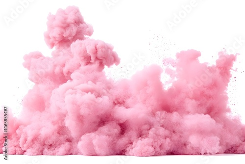 A vibrant, fluffy pink cloud formation against a stark white backdrop. The texture is soft and airy, resembling a dye explosion