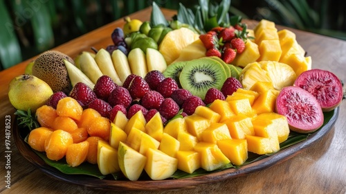 A vibrant fruit platter with a variety of tropical fruits. Healthy foods. Diet