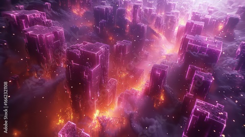 A vibrant, futuristic city of glowing, amethyst-colored, cubic structures rises from a backdrop of fiery, smoky clouds.