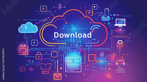 A vibrant, futuristic interface illustrating cloud storage and data download processes, featuring interconnected icons and a central "Download" label.