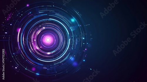A vibrant futuristic technology background featuring circle glowing lines, circuit board patterns, and abstract digital elements in deep blue and purple hues.