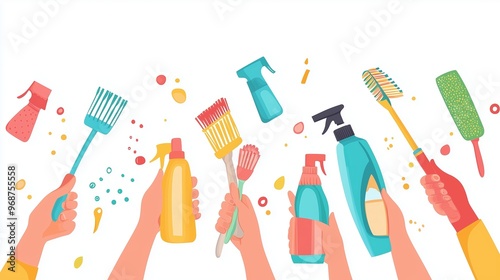 A vibrant gathering of cleaning tools and supplies held by multiple hands in a lively and colorful display for spring cleaning