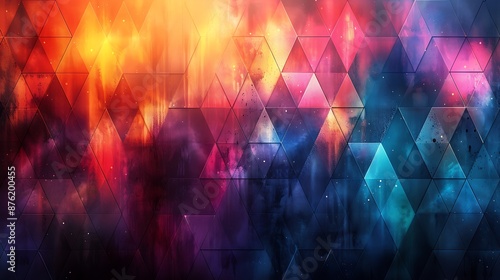 A vibrant geometric abstract background with an abstract tessellation pattern, color transitions from purple to blue to teal.