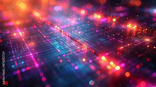 A vibrant geometric abstract background with futuristic neon grids, color transitions from neon purple to pink to orange.