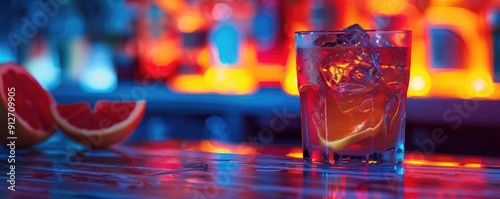 A vibrant glass of cocktail with ice, glowing against a colorful bar backdrop, surrounded by fresh citrus fruit.