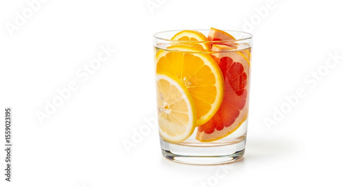 A vibrant glass of refreshing fruit-infused water, featuring colorful slices of lemon, orange, and grapefruit, perfect for a healthy detox.