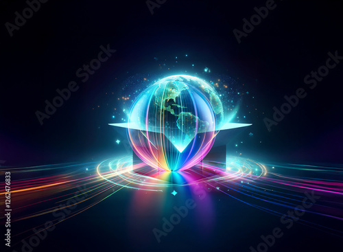 A vibrant globe emits radiant light, displaying continents over a dark backdrop. Colorful beams emanate from beneath, creating a dynamic and futuristic digital scene.
