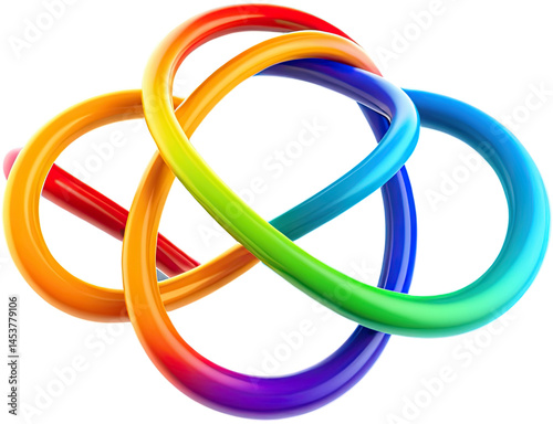 A vibrant, glossy, and colorful ring arrangement in a complex knot against a black background