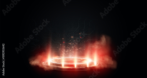 A vibrant glowing circular interface with fiery sparks and smoke, set against a dark technological background with circuit patterns. Futuristic glowing portal red platform with digital circuits.