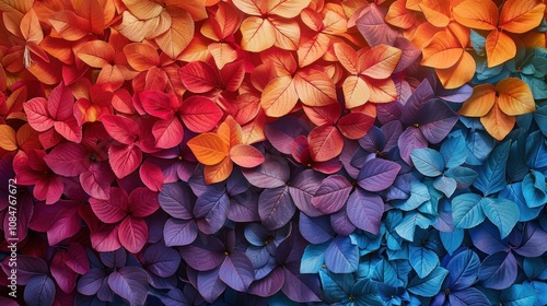 A vibrant gradient of colorful leaves, ranging from deep red to vibrant blue, creating a visually stunning abstract pattern.