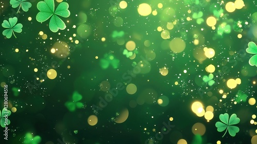 A vibrant green background filled with shamrocks and golden bokeh, evoking a festive and lively atmosphere.