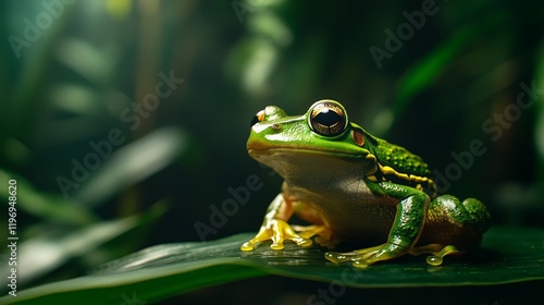 A vibrant green frog perched on a leaf in a lush, tropical environment.