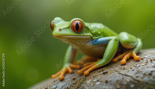 A vibrant green frog with striking orange eyes sits on a log, surrounded by rich foliage. Sunlight filters through leaves, creating a lively outdoor atmosphere