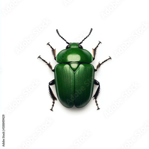 A vibrant green june beetle stands out against a pure white background, showcasing its unique color and texture.