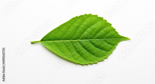 A vibrant green leaf with serrated edges and pronounced veins lies against a clean white backdrop