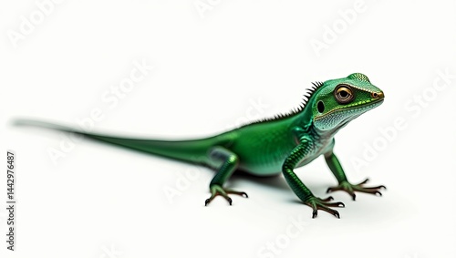 A vibrant green lizard with striking features, showcasing its intricate scales and curious expression against a white background.