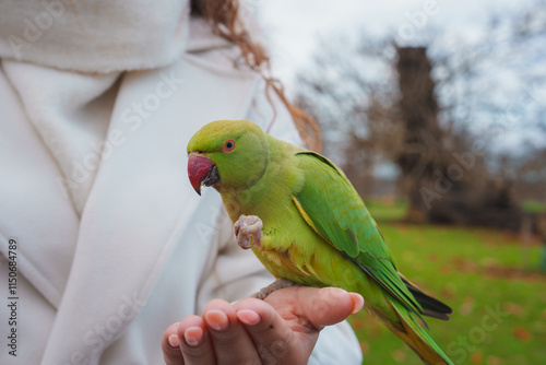 A vibrant green parakeet with a red beak sits on a person's hand in a London park. The person wears a white coat, and bare trees are visible in the background.