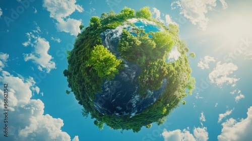 A vibrant green planet illustration, with lush foliage and trees growing on the surface, set against a bright blue sky, representing eco-friendly concepts and sustainability.