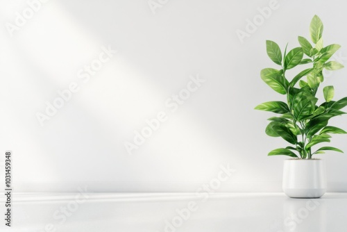 A vibrant green plant in a white pot against a bright, minimalistic background, perfect for interior decoration.