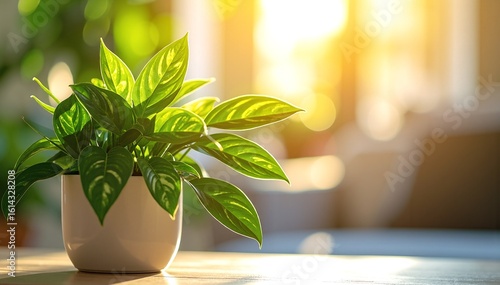 A vibrant green plant with broad leaves basking in warm sunlight, casting soft shadows on a wooden surface, creating a serene and inviting atmosphere.