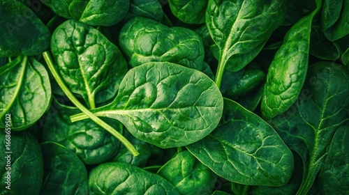 A vibrant green spinach leaf with a textured surface, set against a dark green background.