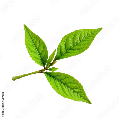 A vibrant green tea leaf with a stem, isolated on a transparent background.