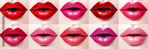 A vibrant grid of close-up digital illustrations showcasing lips with various shades of glossy lipsticks