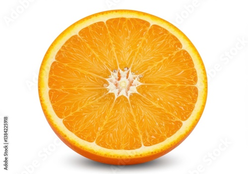 A vibrant half orange slice displaying its juicy segments on a clean white background studio shot