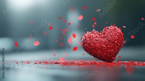 A vibrant heart made of glittery red petals surrounded by scattered petals evokes feelings of love and romance, suitable for Valentine's Day promotions, wedding invitations, or romantic content,