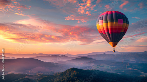 A vibrant hot air balloon ascends above a misty mountainous landscape during a colorful sunset.