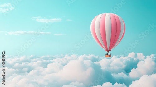 A vibrant hot air balloon floats gracefully above soft white clouds against a clear blue sky. Ideal for themes of adventure, freedom, and tranquility.