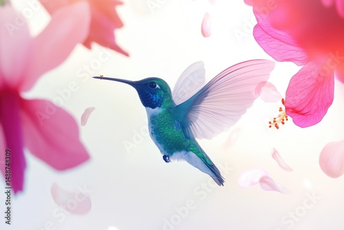 A vibrant hummingbird hovers amidst pink hibiscus flowers, capturing a moment of delicate beauty in nature.