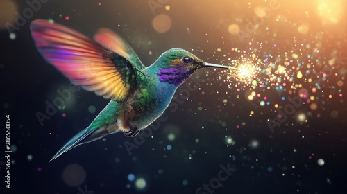 A vibrant hummingbird in flight with glowing, magical sparkles emanating from its beak, set against a soft, dark background.