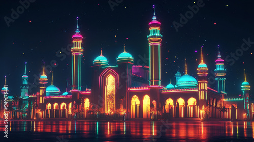 A vibrant illuminated palace at night with colorful towers and intricate architecture near a tranquil water body