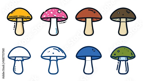 A vibrant illustration displays eight stylized mushrooms.