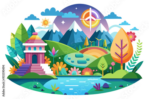 A vibrant illustration of a peaceful mountain landscape with a colorful temple.