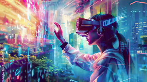 A vibrant illustration of a young woman using a virtual reality headset interacting with holographic displays and digital elements