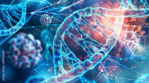A vibrant illustration of DNA strands and cells interconnected within a digital network, showcasing the complexity of genetics and molecular biology