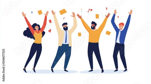 A vibrant illustration of four cheerful people celebrating with raised arms and colorful confetti, expressing joy and excitement.