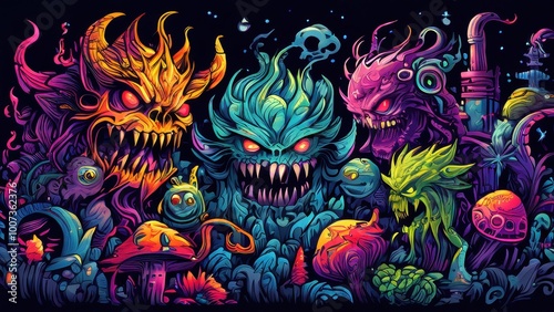 A vibrant illustration of monstrous creatures amidst colorful flora and surreal elements.
