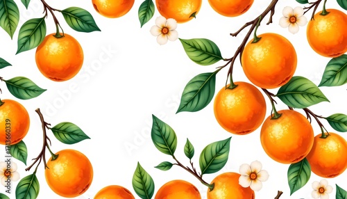 A vibrant illustration of orange groves, with numerous oranges in various stages of ripeness hanging from lush green trees