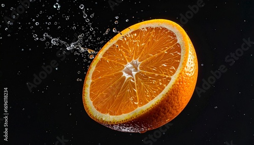 A vibrant image of a halved orange submerged in water, with water droplets and a dark backdrop, evoking freshness