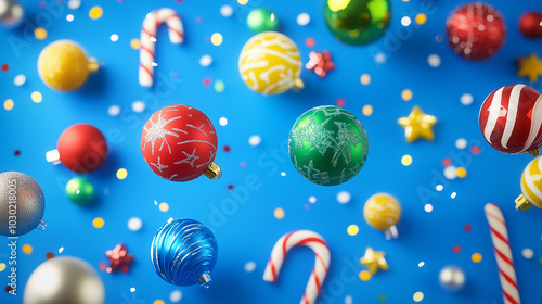 A vibrant image showcasing floating holiday-themed ornaments, featuring colorful balls, stars, and candy canes on an elegant blue background, highlighting celebration themes