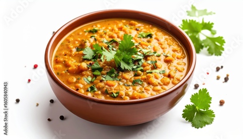 A vibrant Indian lentil curry served in a clay bowl, topped with fresh cilantro, isolated on a white background.